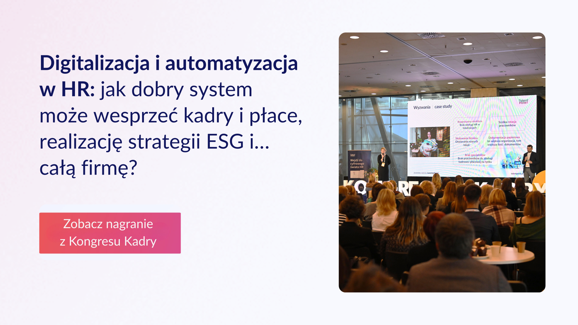 Podczas 40. edycji Kongresu Kadry swoją drogą do cyfrowej transformacji HR podzielili się Agnieszka Giermek-Ziółkowska i Marek Deręgowski, przedstawiając case study wdrożenia systemu TalentPoint w strukturach EBS. Zobacz, jak wygląda praktyczne wdrożenie HR tech i dowiedz się, jak może ono działać również w Twojej organizacji.